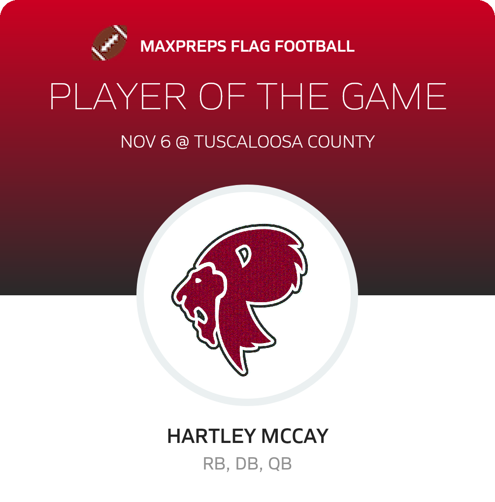 Congratulations to #3 Hartley McCay for being selected the Prattville Girls Flag Football Player of the Game.
