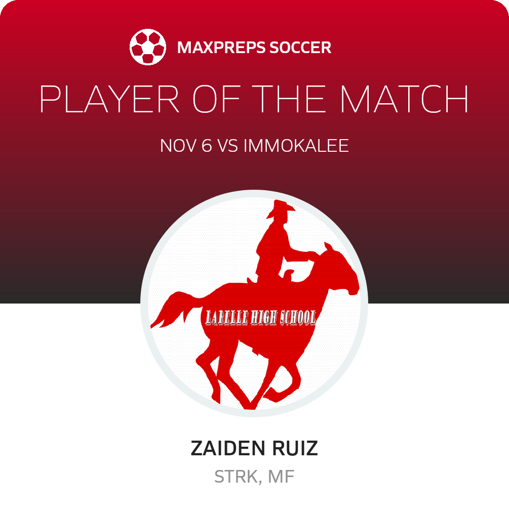 Congratulations to #11 Zaiden Ruiz for being selected the LaBelle Soccer Player of the Match.