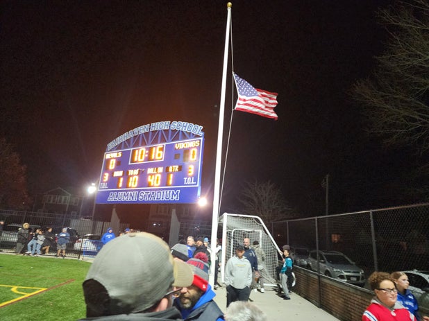 November 7, 2025: Fairhaven, MA 02719 The crowd at Friday's non-league contest between the Fairhaven Blue Devils (Fairhaven, MA) and the visiting East Bridgewater Vikings (East Bridgewater, MA), witnessed Fairhaven's football squad wallop East Bridgewater by a tally of 44-8.