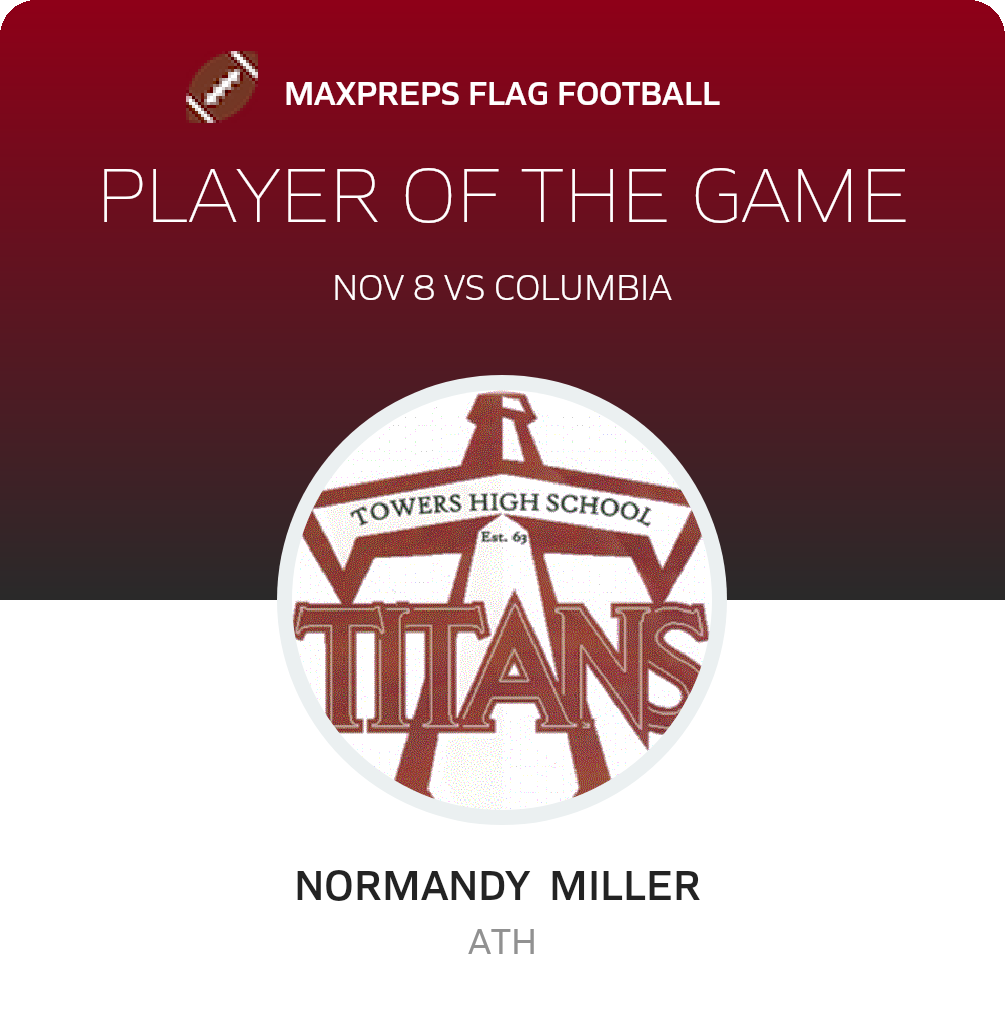 Congratulations to Normandy Miller for being selected the Towers Girls Flag Football Player of the Game.