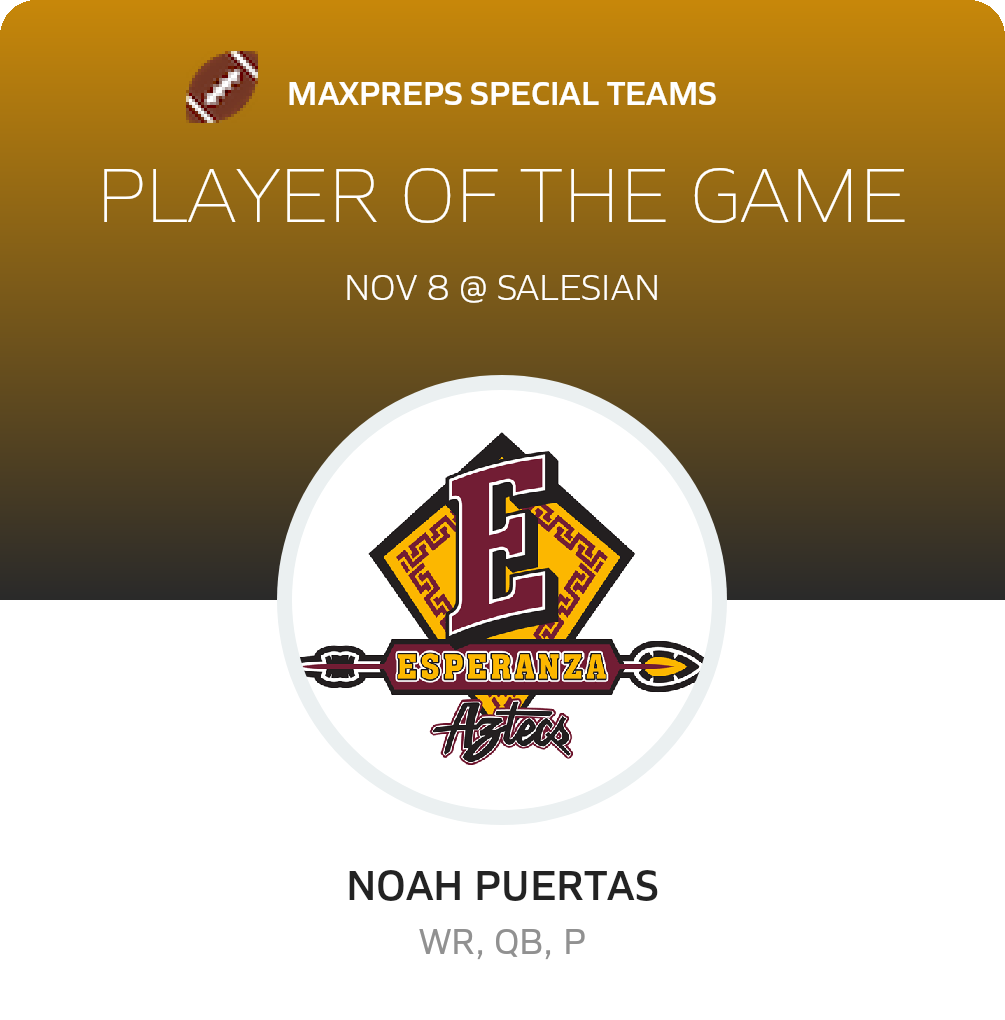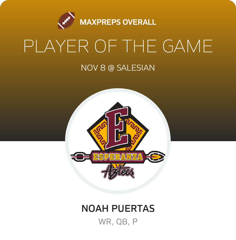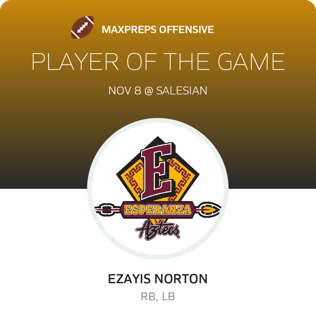 Congratulations to #12 Noah Puertas (overall and special teams), #23 Ezayis Norton (offensive) and #52 Aiden Shahrestani (defensive) for being selected the Esperanza Football Players of the Game.
