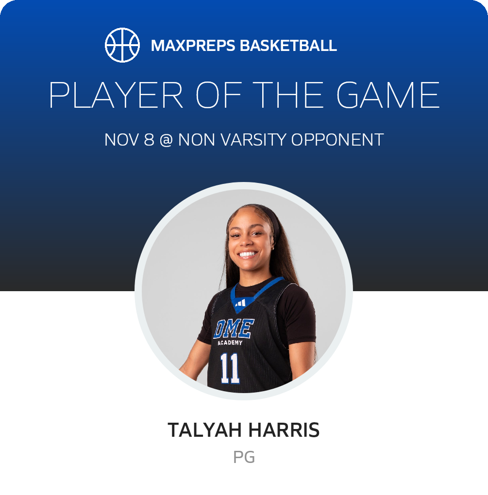 Congratulations to #11 Talyah Harris for being selected the DME Academy Blue Girls Basketball Player of the Game.