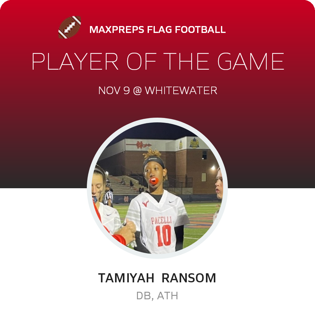 Congratulations to #10 Tamiyah Ransom for being selected the St. Anne-Pacelli Girls Flag Football Player of the Game.