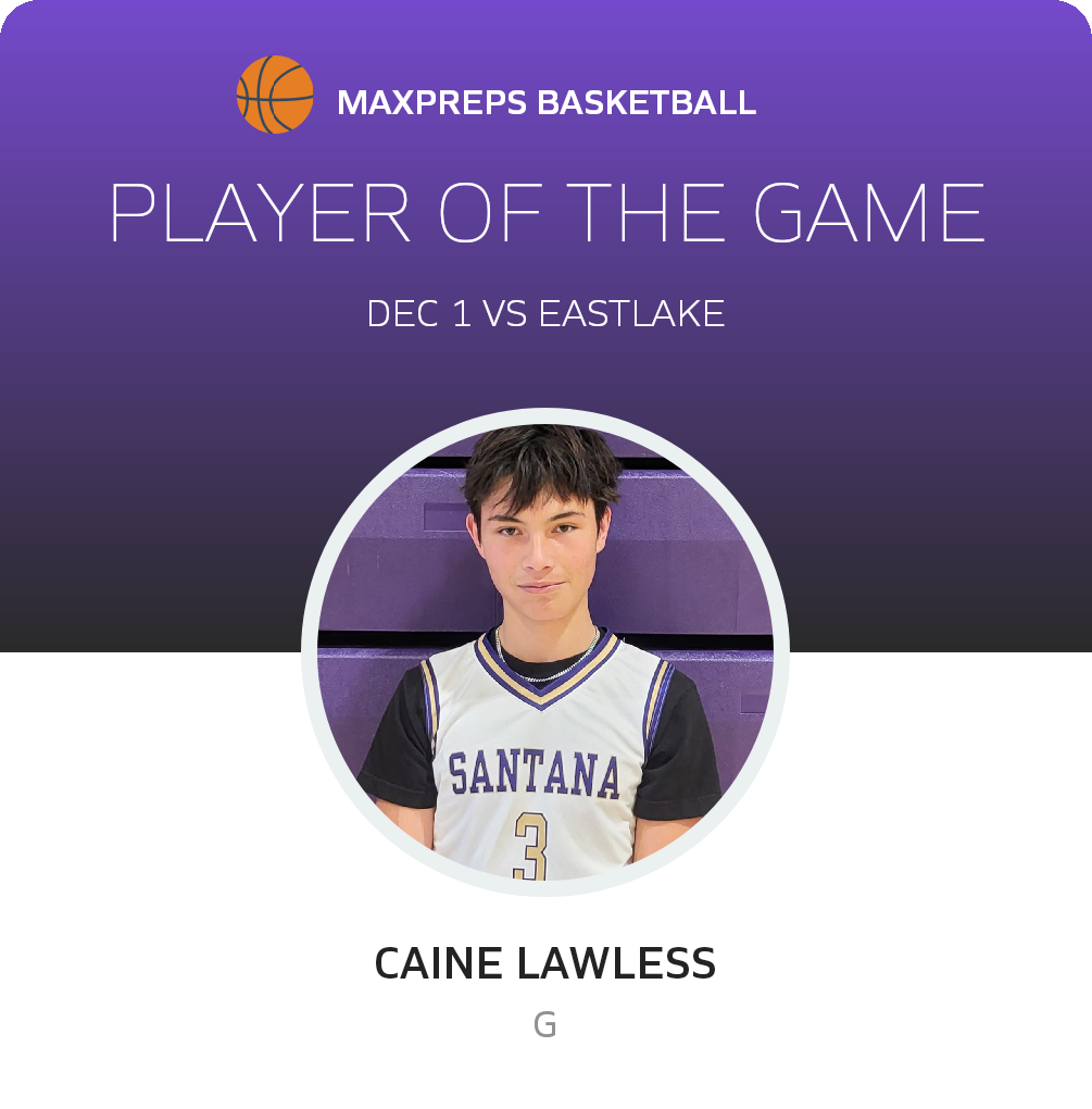 Congratulations to #3 Caine Lawless for being selected the Santana JV Basketball Player of the Game.