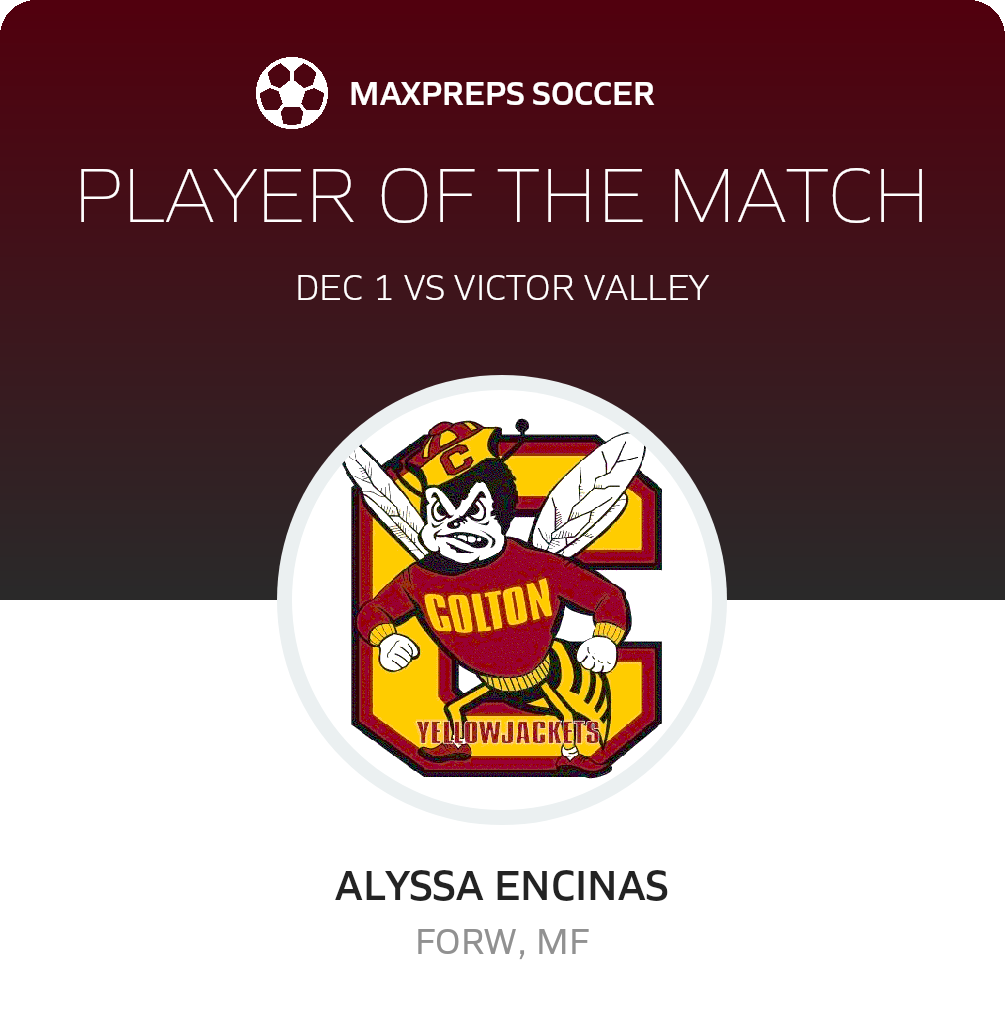 Congratulations to #7 Alyssa Encinas for being selected the Colton Girls JV Soccer Player of the Match.