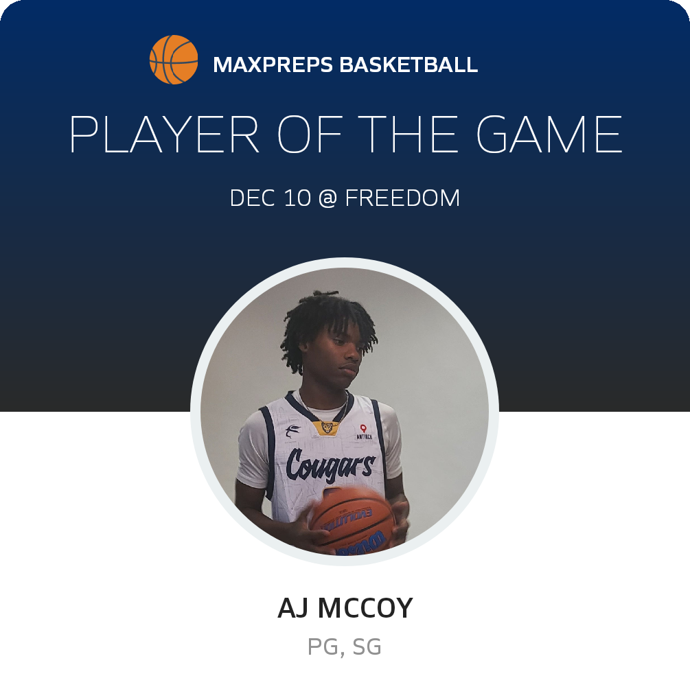 With the victory, Freedom upgrades its record to 4-2 on the campaign. The Falcons host San Ramon Valley (Danville, CA) to play the Wolves in a non-league bout on Tuesday, December 13. The Wolves come into the bout with a record of 7-1. San Ramon Valley won 62-56 in their recent non-league bout against California (San Ramon, CA)