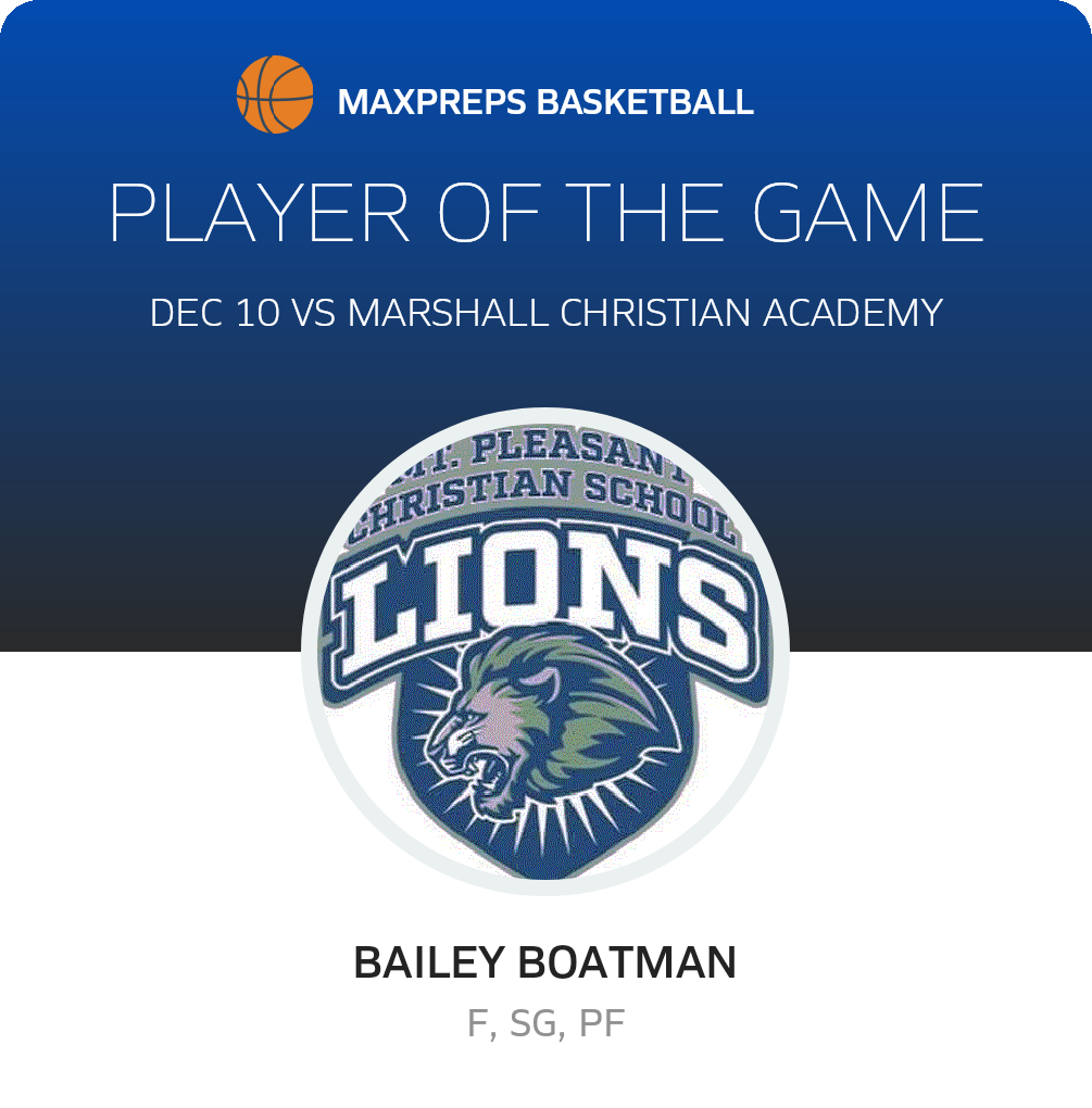 Congratulations to #00 Bailey Boatman for being selected the Mt. Pleasant Christian Girls Basketball Player of the Game.