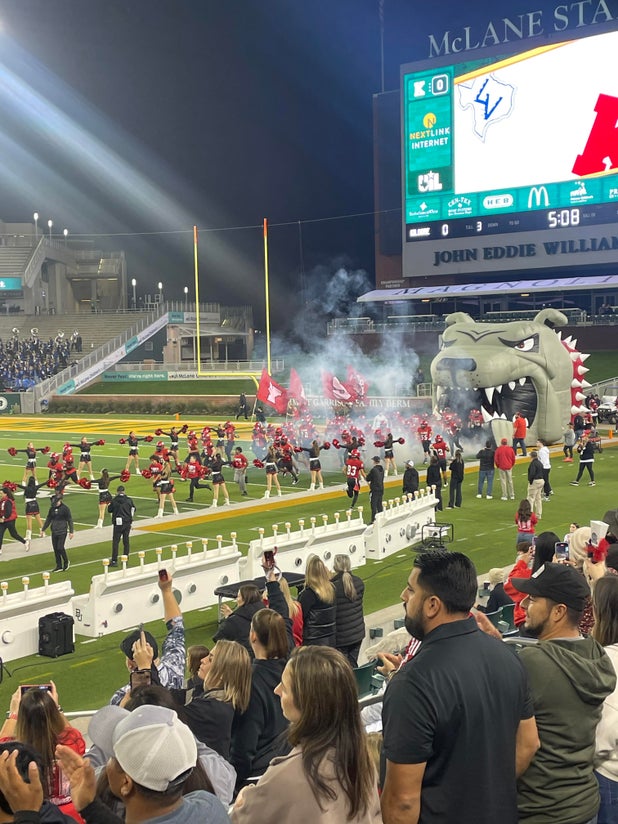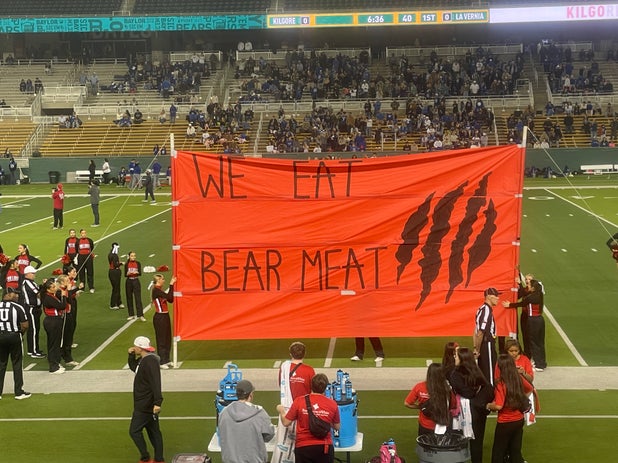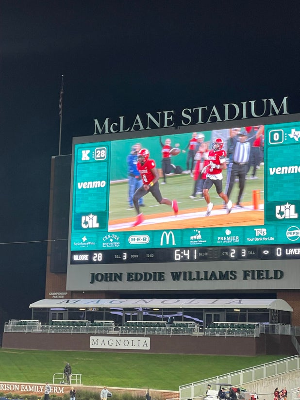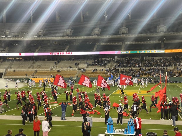 The Kilgore (TX) varsity football team won Friday's neutral playoff game against La Vernia (TX) by a score of 49-0.