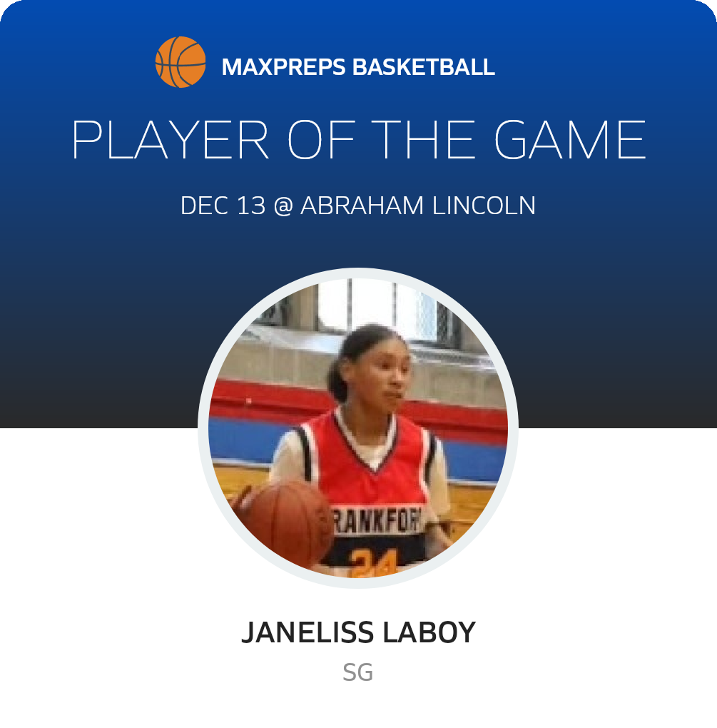 Congratulations to #24 Janeliss Laboy for being selected the Frankford Girls Basketball Player of the Game.