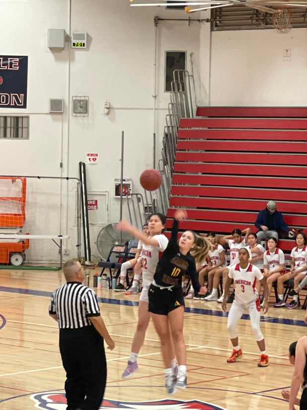December 16, 2022: Fremont, CA 94536 American Eagles (Fremont, CA) backers were in high spirits Friday as they witnessed their basketball squad bounce the visiting Amador Valley Dons (Pleasanton, CA), 67-36 in a non-league bout.