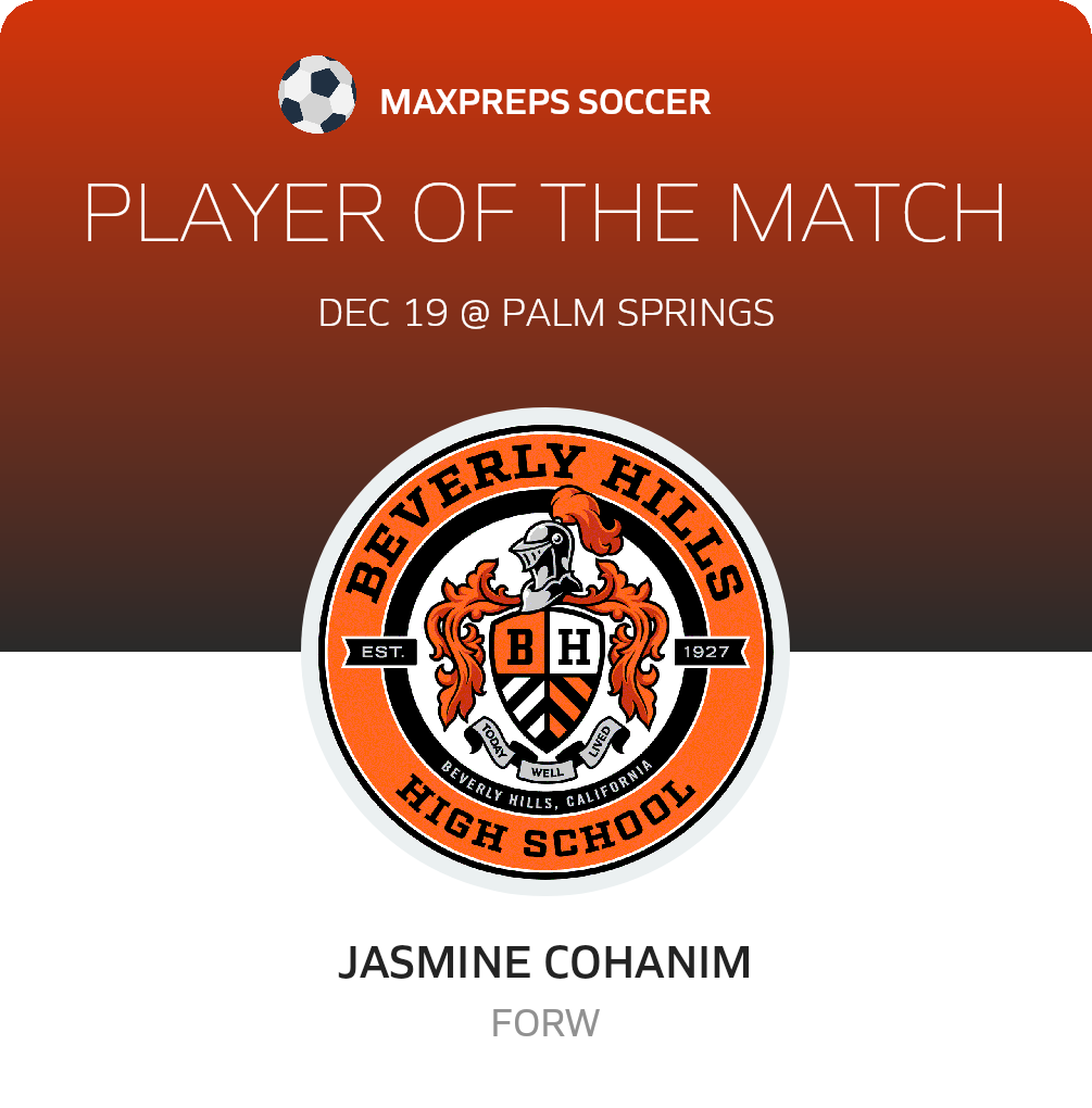 Congratulations to #13 Jasmine Cohanim for being selected the Beverly Hills Girls Soccer Player of the Match.