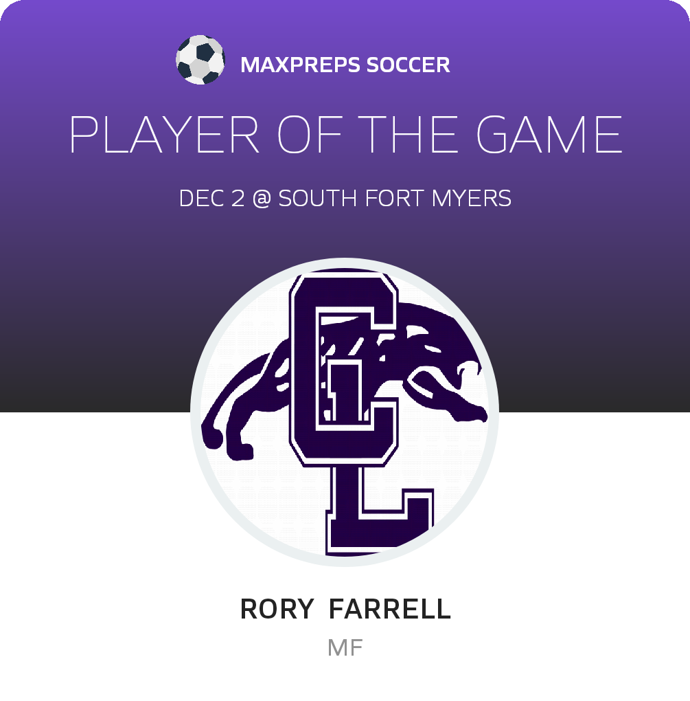 Congratulations to #6 Rory Farrell for being selected the Cypress Lake Girls Soccer Player of the Match.