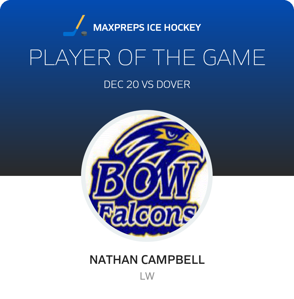 December 20, 2022: Bow, NH 03304 The Bow Falcons (Bow, NH) ice hockey nipped the visiting Dover Green Wave (Dover, NH), 4-3 in Tuesday's league battle.