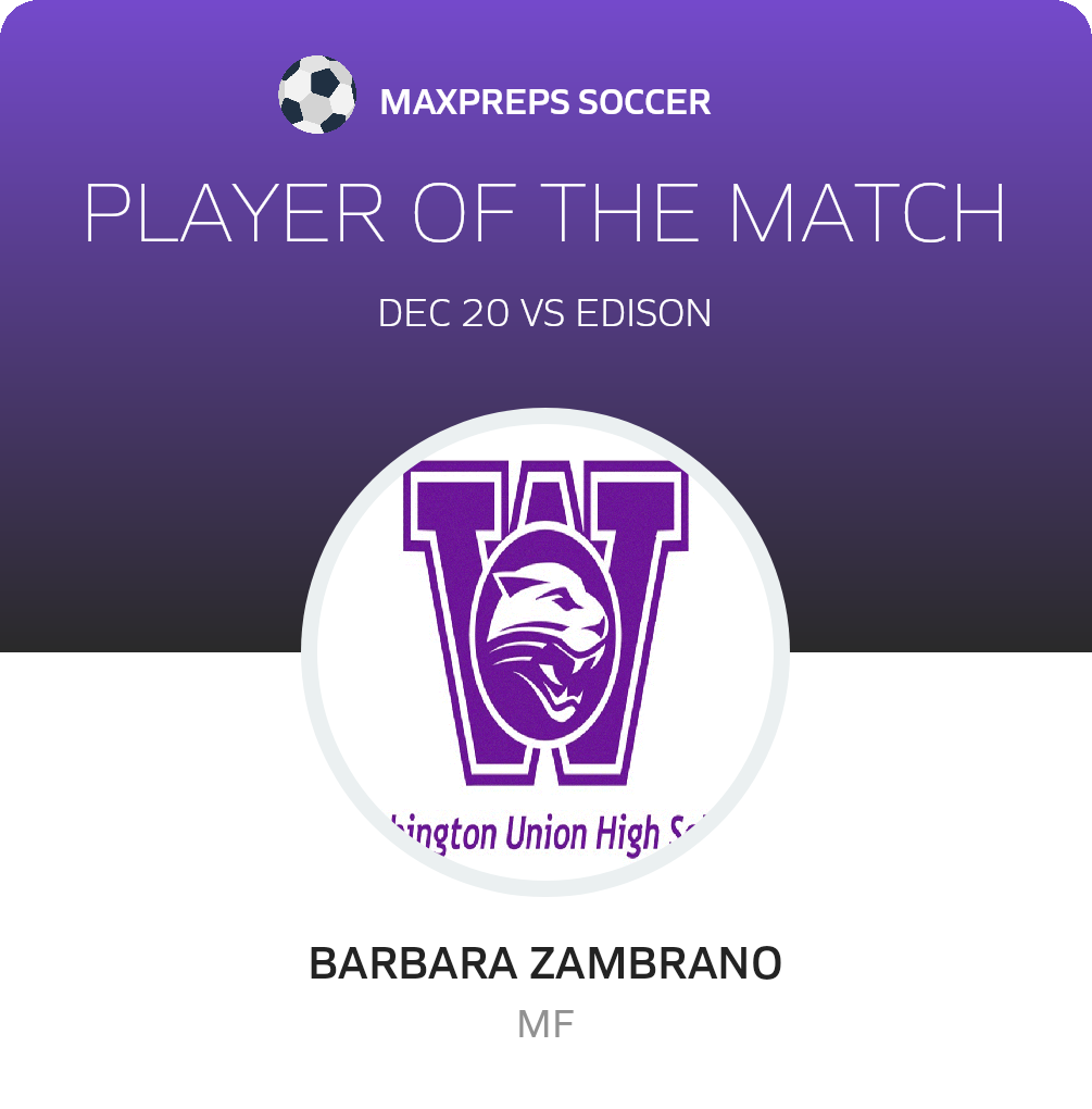 Congratulations to #40 Barbara Zambrano for being selected the Washington Union Girls JV Soccer Player of the Match.