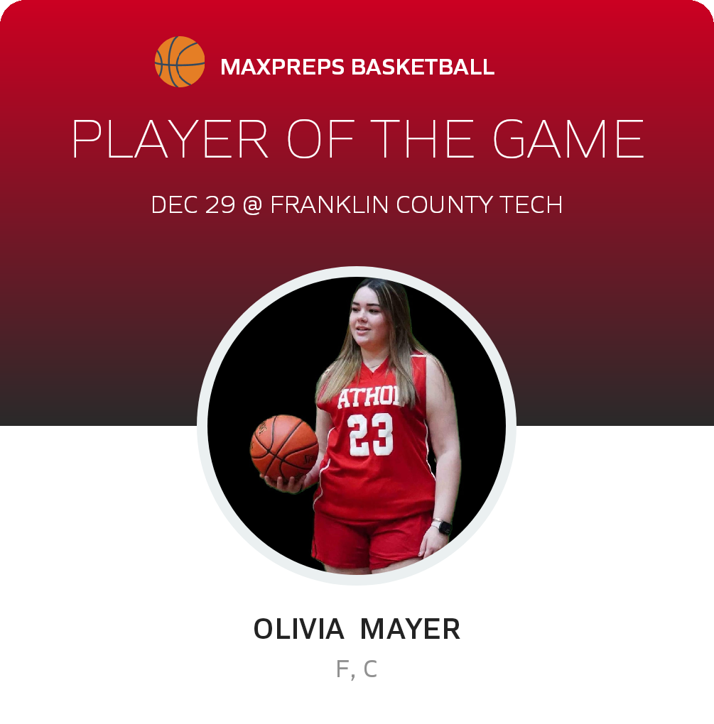 Congratulations to #33 Olivia Mayer for being selected the Athol Girls JV Basketball Player of the Game.