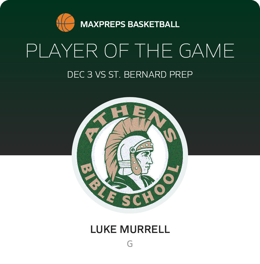 Congratulations to ##1 Luke Murrell for being selected the Athens Bible Basketball Player of the Game.