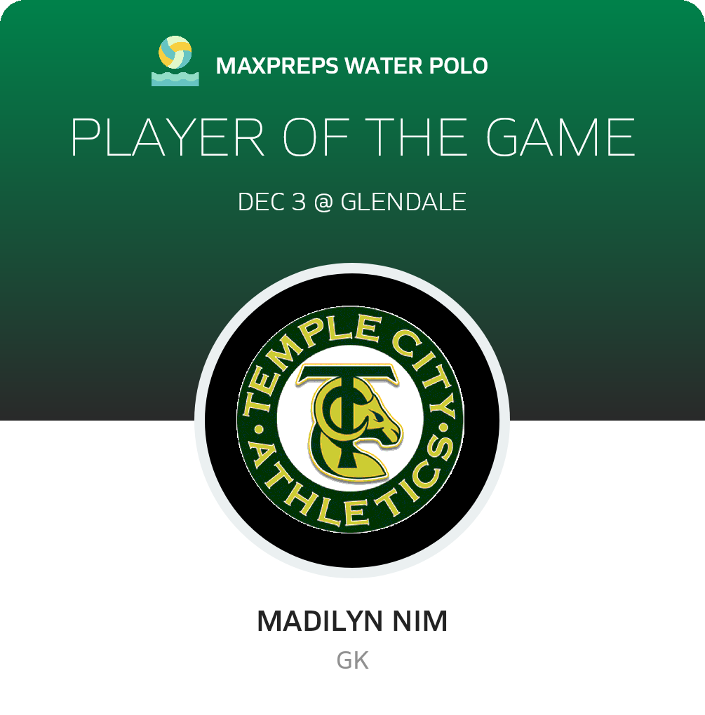 Congratulations to #1 Madilyn Nim for being selected the Temple City Girls Water Polo Player of the Game.