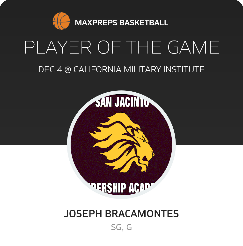 Congratulations to #5 Joseph Bracamontes for being selected the San Jacinto Leadership Academy Basketball Player of the Game.