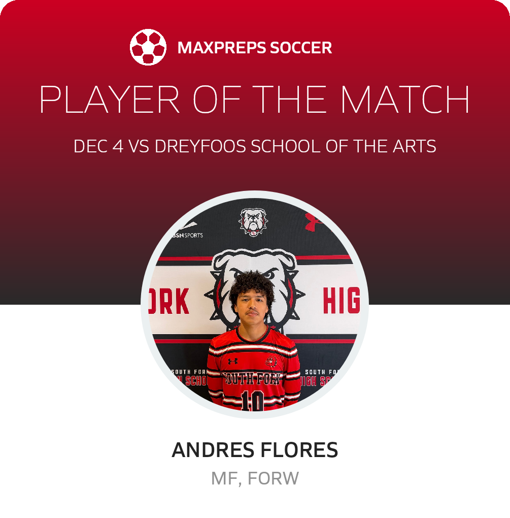 Congratulations to #10 ANDRES FLORES for being selected the South Fork Soccer Player of the Match.