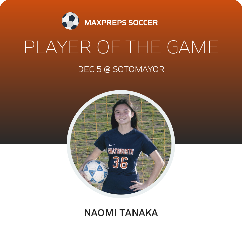 Congratulations to #36 Naomi Tanaka for being selected the Chatsworth Girls Soccer Player of the Match.