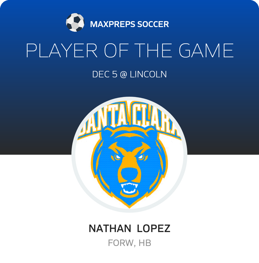 Congratulations to #9 Nathan Lopez for being selected the Santa Clara JV Soccer Player of the Match.