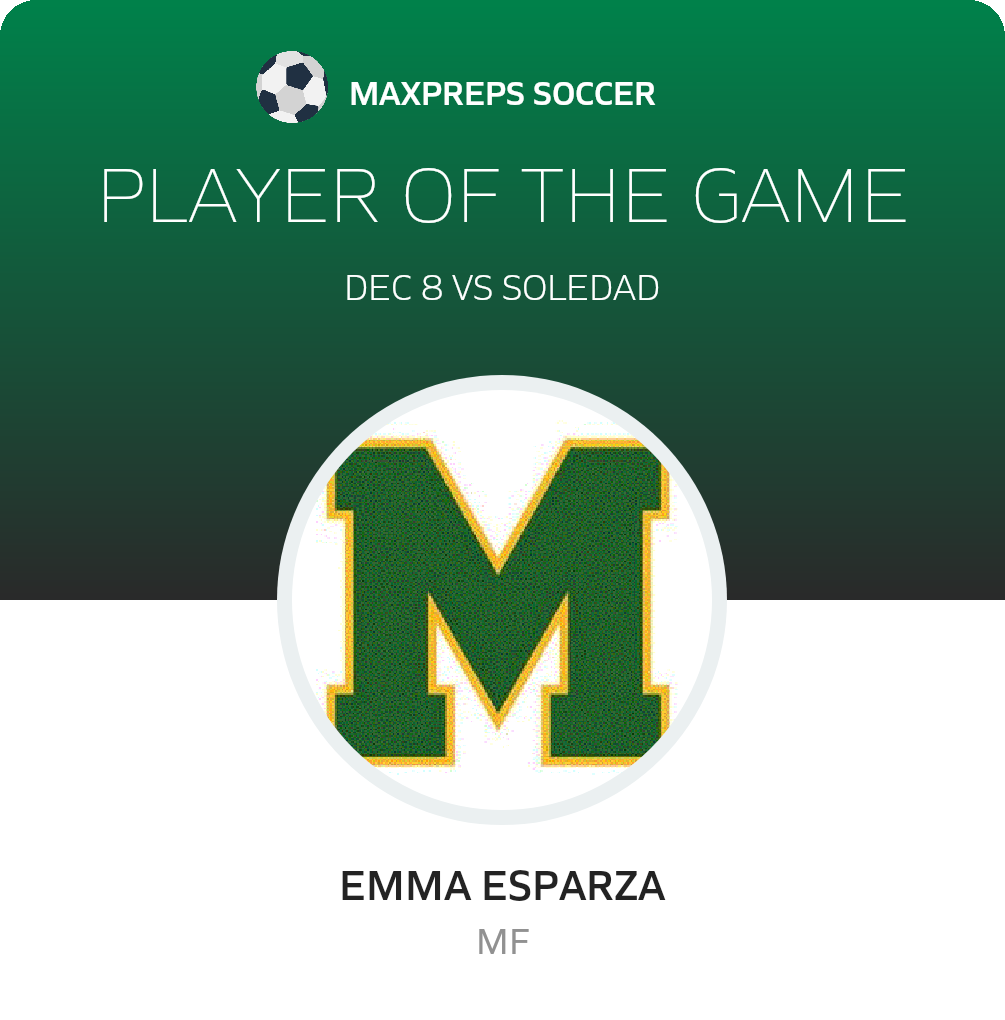 Congratulations to #12 Emma Esparza for being selected the Monterey Girls Soccer Player of the Match.