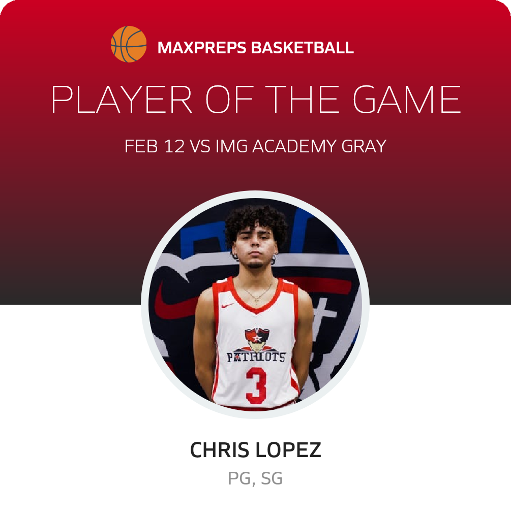 February 12, 2024: Orlando, FL 32817 Downey Christian Patriots (Orlando, FL) backers were in high spirits Monday as they witnessed their basketball squad bounce the visiting IMG Academy Gray Ascenders (Bradenton, FL), 70-39 in a non-league bout.