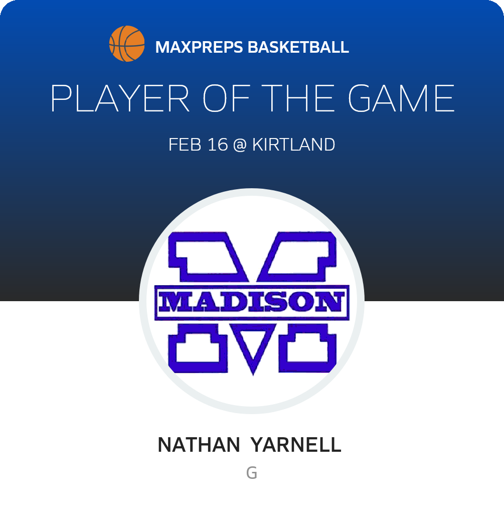 Congratulations to #20 Nathan Yarnell for being selected the Madison JV Basketball Player of the Game.