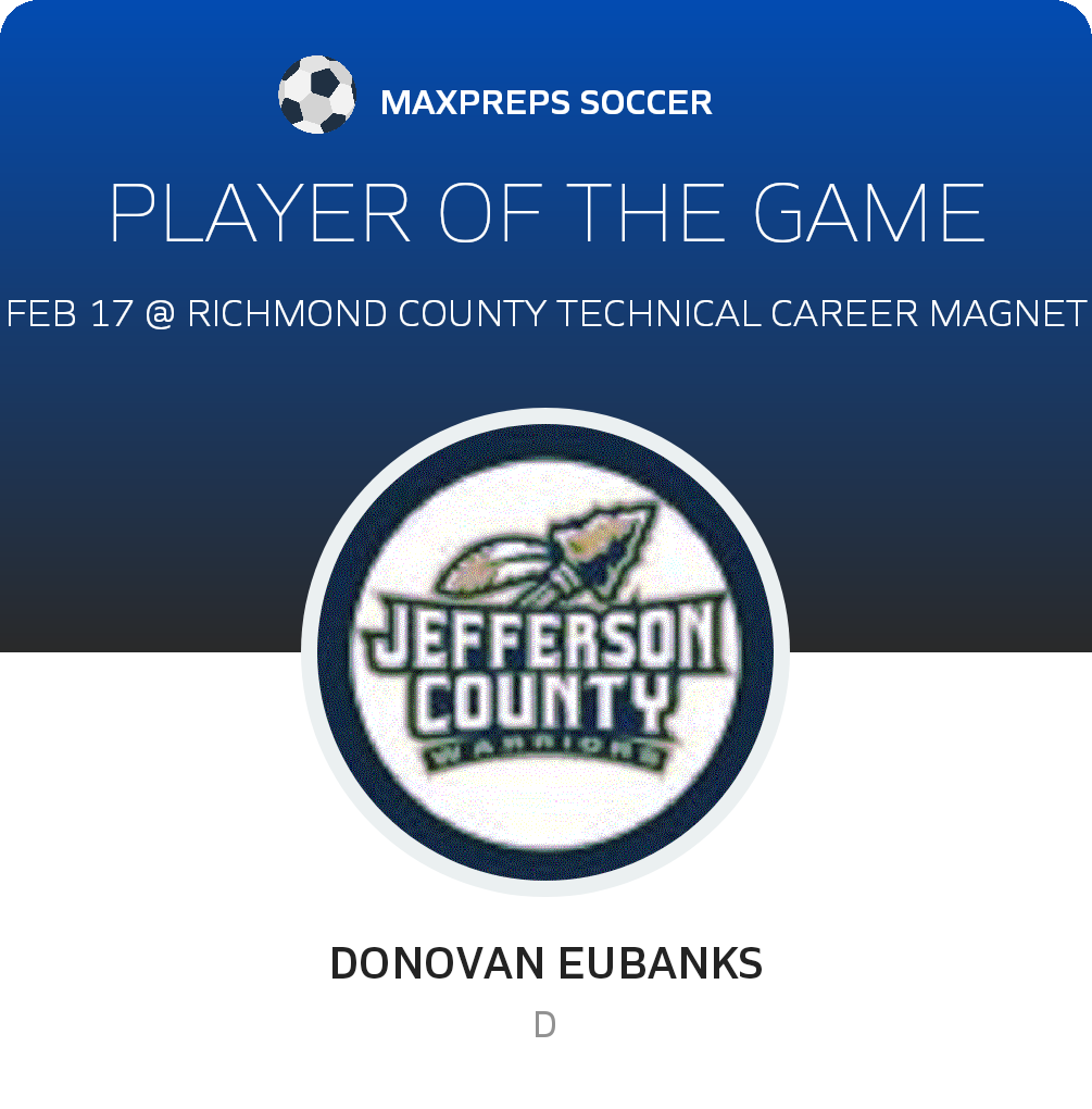 Congratulations to #8 Donovan Eubanks for being selected the Jefferson County Soccer Player of the Match.