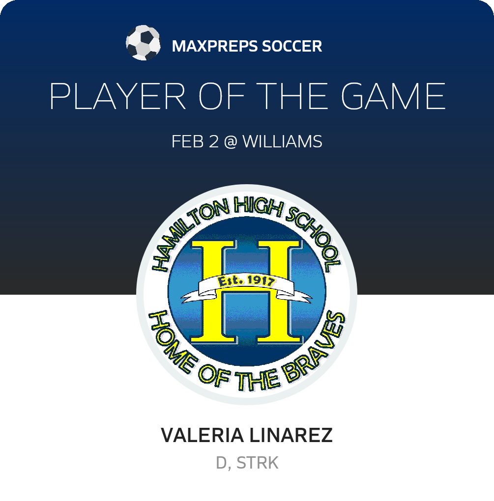 Congratulations to #13 Valeria Linarez for being selected the Hamilton Girls Soccer Player of the Match.