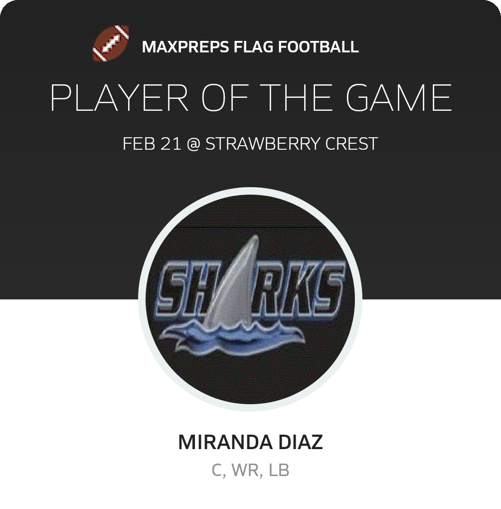 Congratulations to #13 Ariana Ruiz for being selected the Strawberry Crest Girls Flag Football Player of the Game.