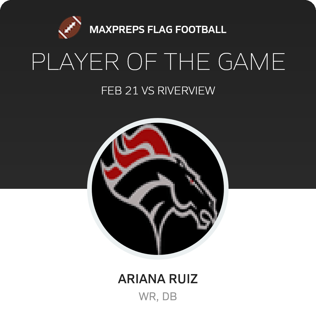 Congratulations to #82 Miranda Diaz for being selected the Riverview Girls Flag Football Player of the Game.