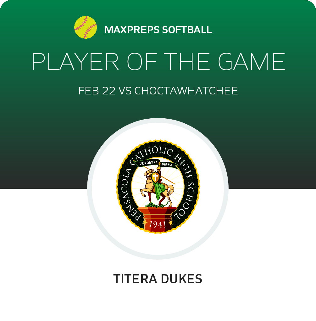 Congratulations to Titera Dukes for being selected the Pensacola Catholic Softball Player of the Game.