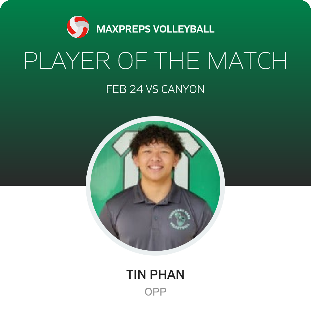 Congratulations to #2 Tin Phan for being selected the Thousand Oaks Boys JV Volleyball Player of the Match.