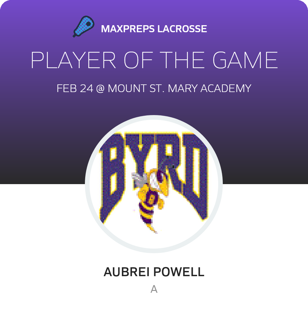 Congratulations to #21 Aubrei Powell for being selected the Byrd Girls Lacrosse Player of the Game.