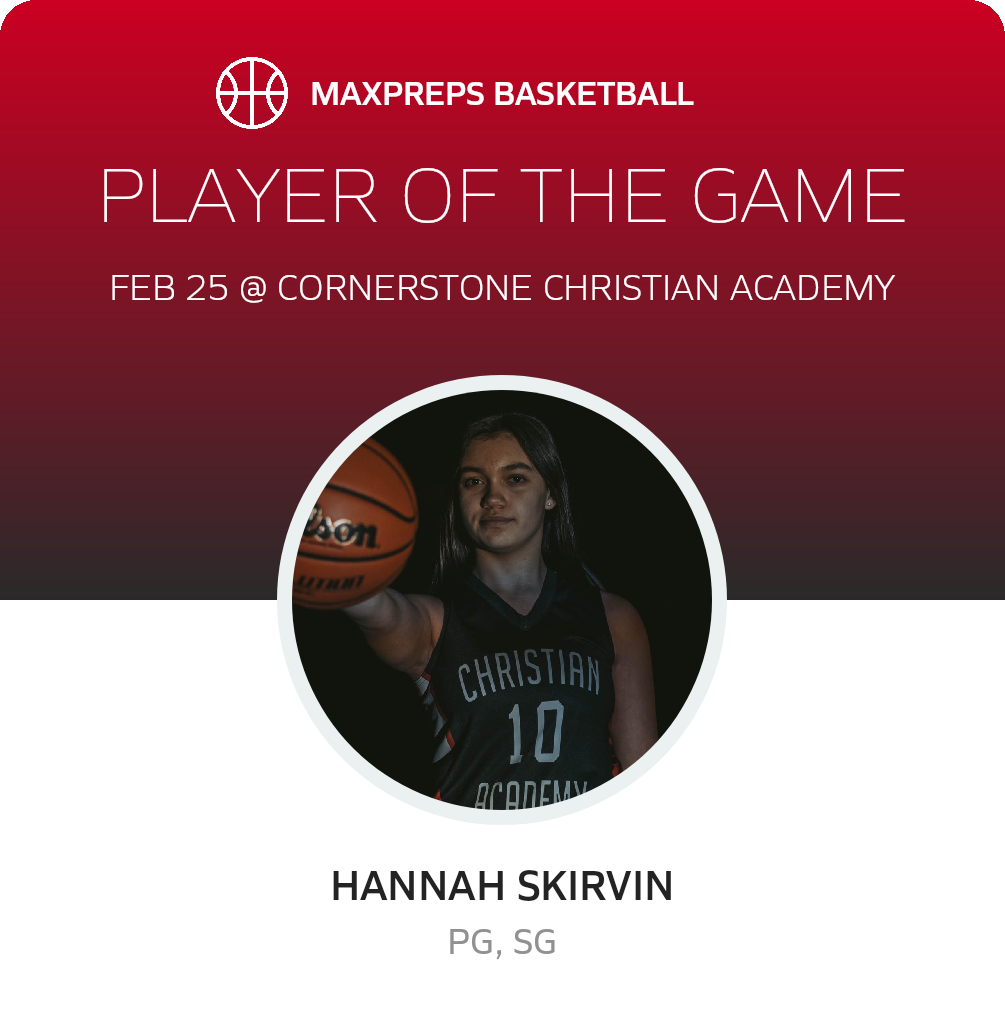Congratulations to #10 Hannah Skirvin for being selected the Christian Academy of Madison Girls Basketball Player of the Game.