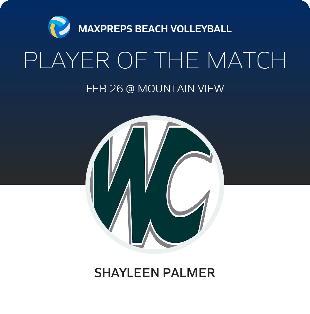 Congratulations to #12 Shayleen Palmer for being selected the Willow Canyon Beach Volleyball Player of the Match.