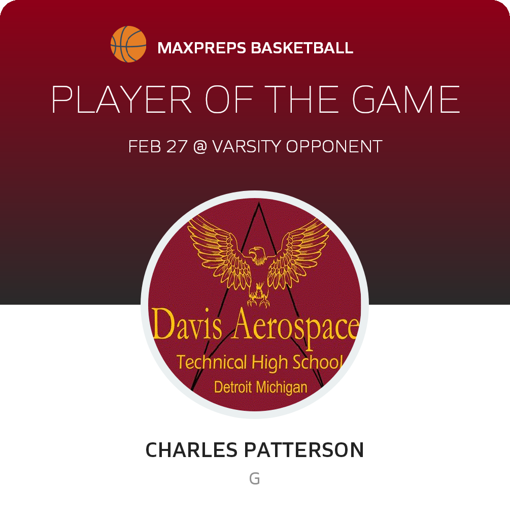 Congratulations to Charles Patterson for being selected the Davis Aerospace Tech Basketball Player of the Game.