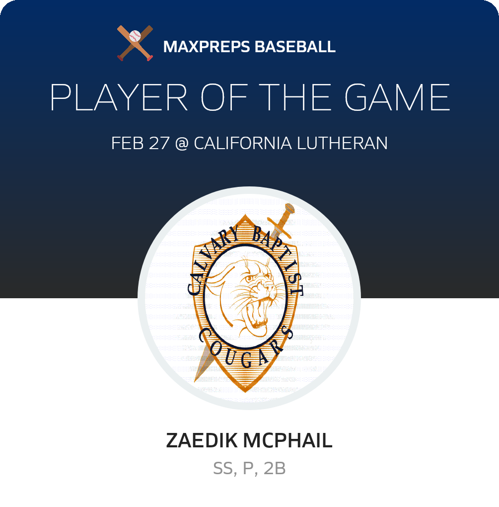 February 27, 2024: Wildomar, CA 92595 The Calvary Baptist Cougars baseball team scored 14 runs and limited the host California Lutheran C-Hawks to 7 in the Cougars non-league victory on Tuesday.