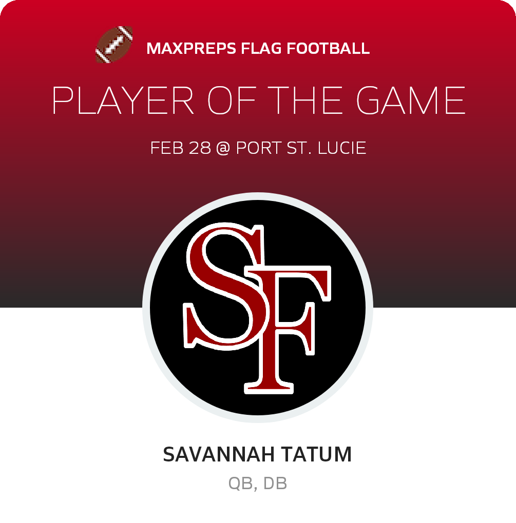 The Port St. Lucie (FL) varsity flag football team lost Tuesday's home conference game against South Fork (Stuart, FL) by a score of 54-0.