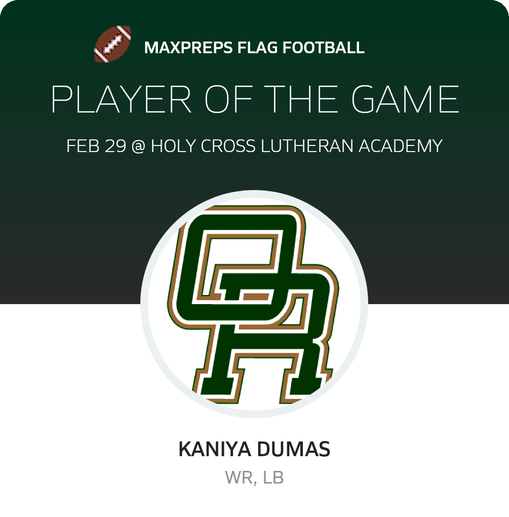 Congratulations to Kaniya Dumas for being selected the Oak Ridge Girls Flag Football Player of the Game.