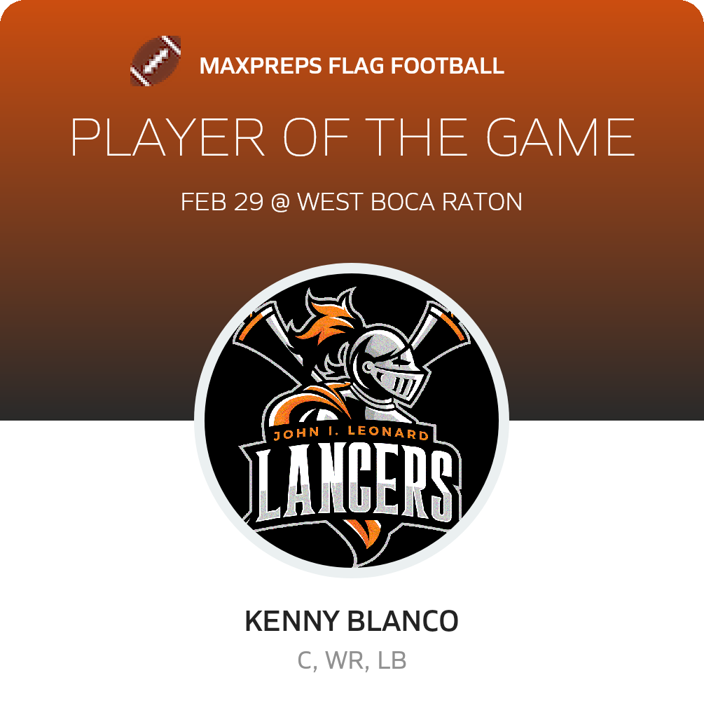 Congratulations to #13 Kenny Blanco for being selected the Leonard Girls Flag Football Player of the Game.