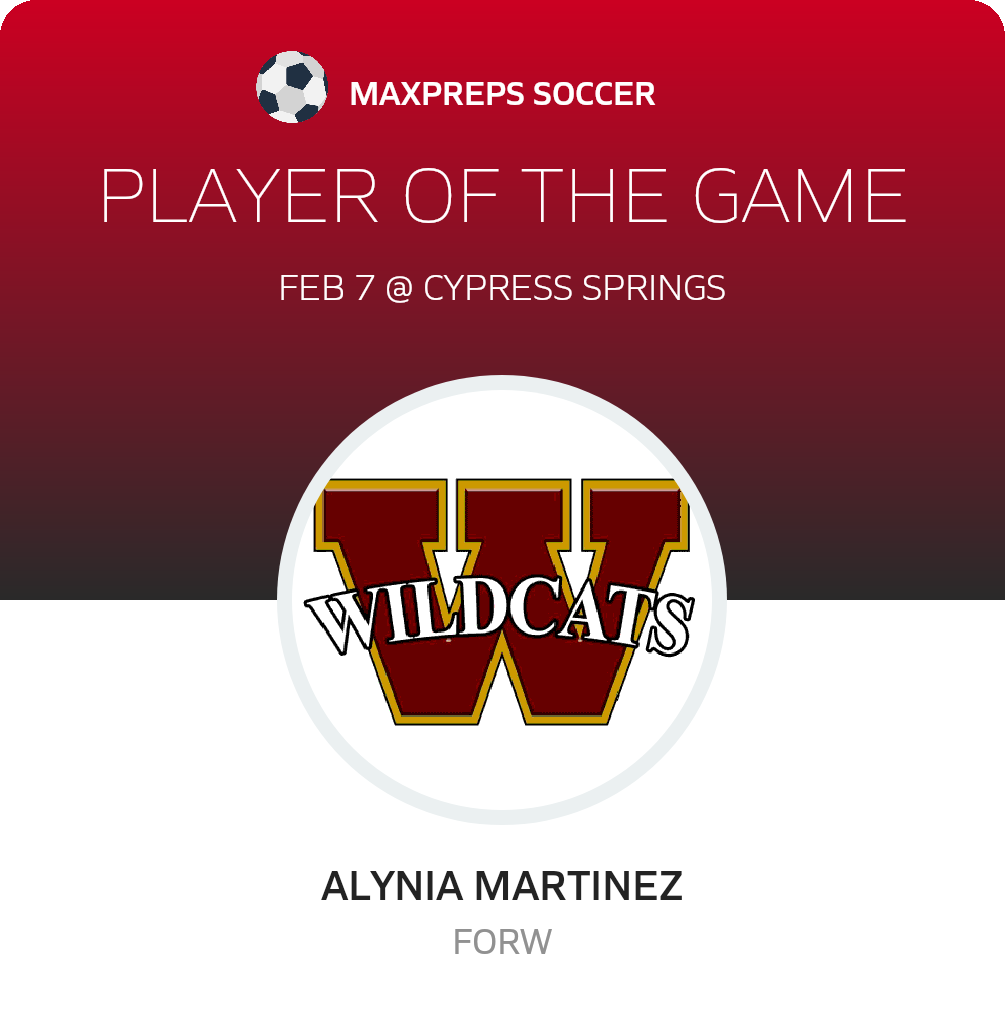 Congratulations to #19 Alynia Martinez for being selected the Cypress Woods Girls Soccer Player of the Match.