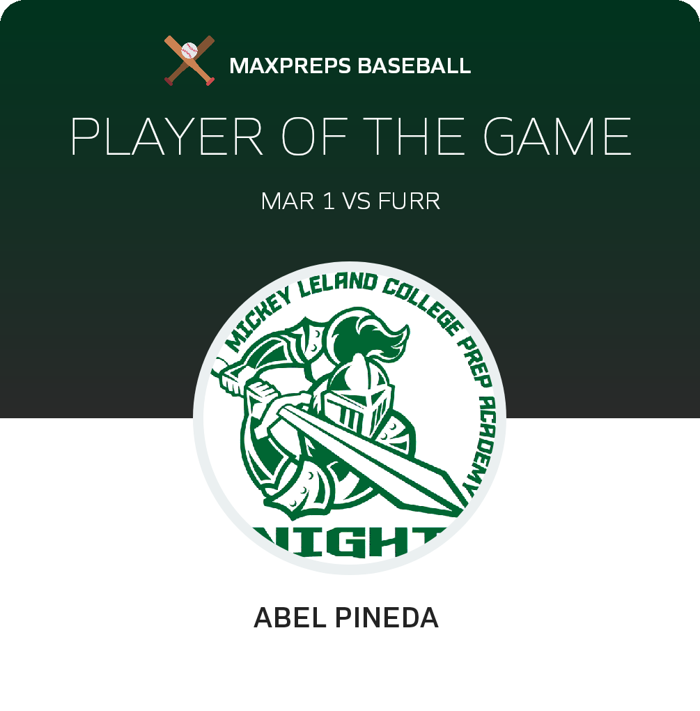 Congratulations to #1 Abel Pineda for being selected the Mickey Leland College Preparatory Academy for Young Men Baseball Player of the Game.
