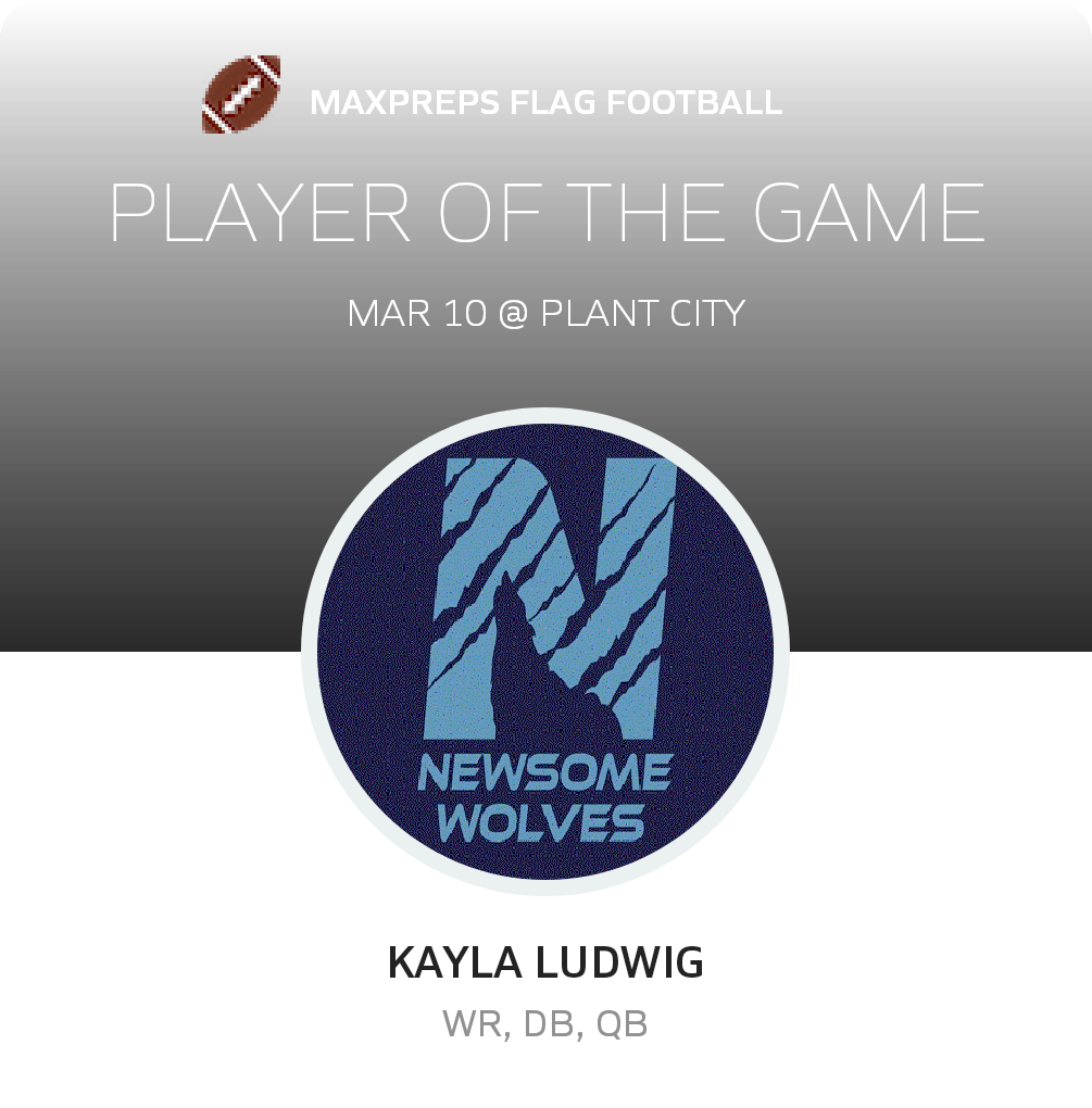 Congratulations to #13 Kayla Ludwig for being selected the Newsome Girls Flag Football Player of the Game.