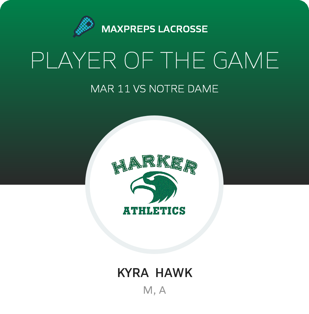 Congratulations to #15 Kyra Hawk for being selected the Harker Girls Lacrosse Player of the Game.
