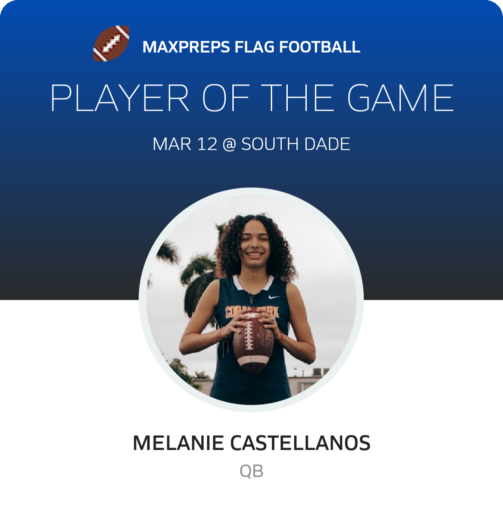 Congratulations to #3 Melanie Castellanos for being selected the Coral Park Girls Flag Football Player of the Game.