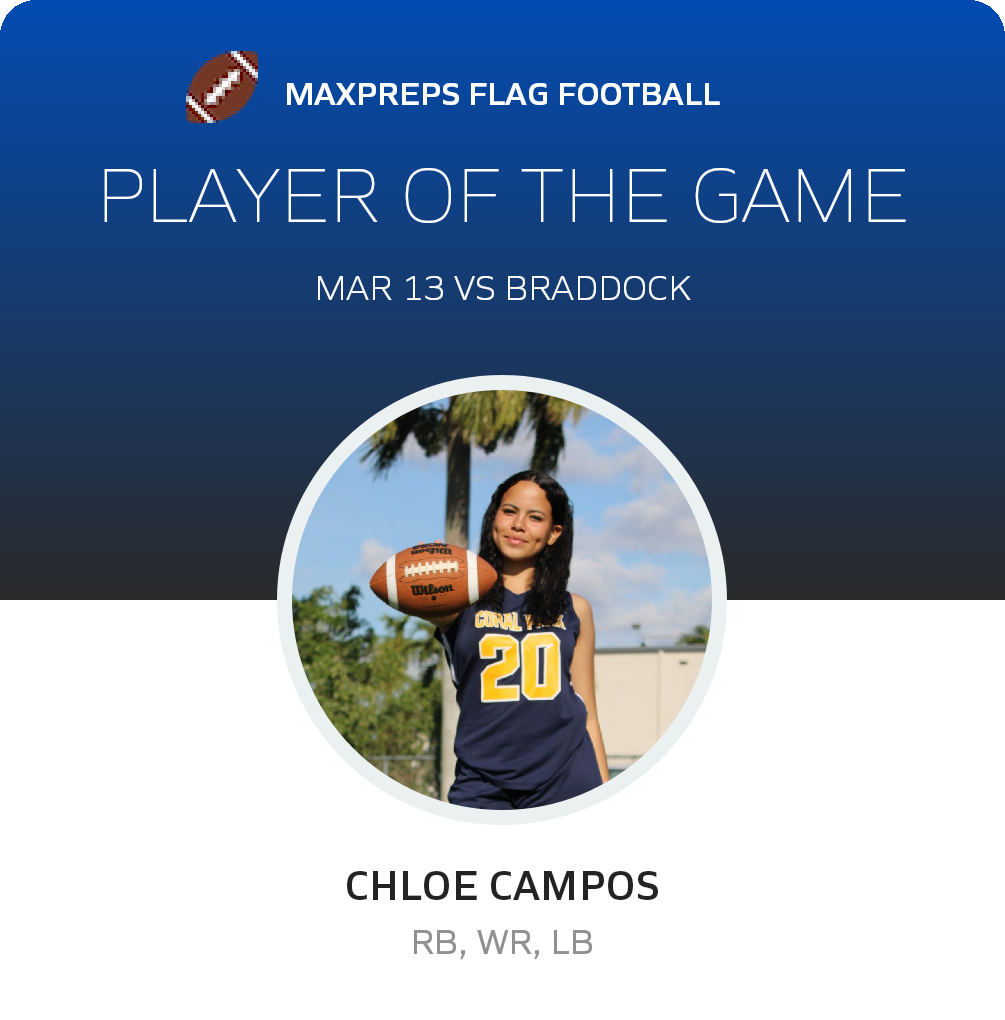 Congratulations to #20 Chloe Campos for being selected the Coral Park Girls Flag Football Player of the Game.