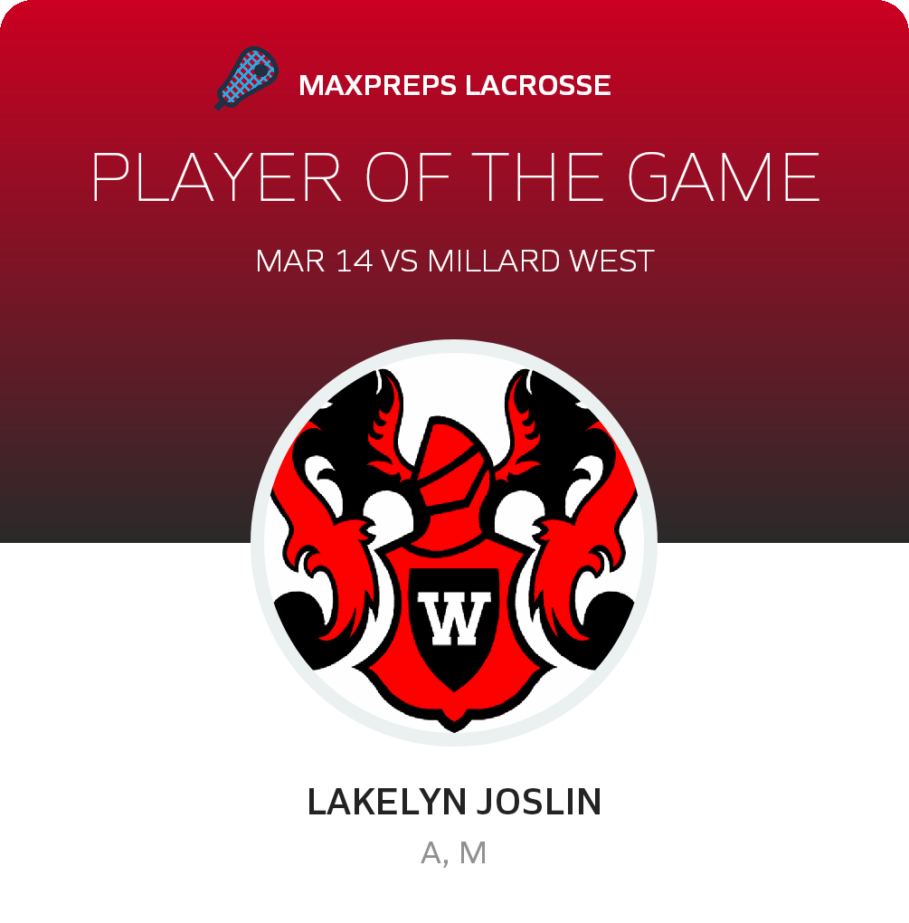 Congratulations to #0 Lakelyn Joslin for being selected the Omaha Westside Girls Lacrosse Player of the Game.