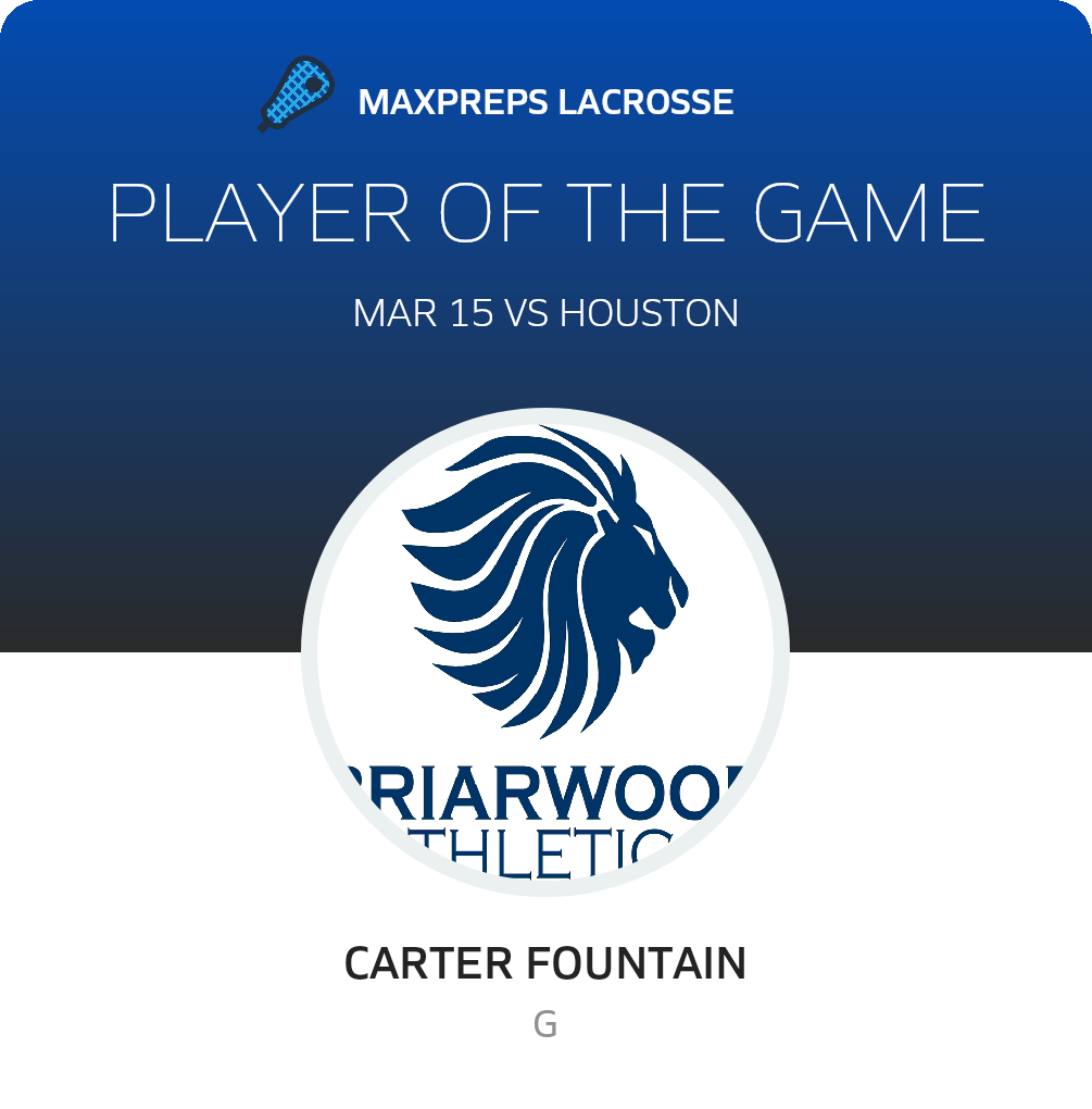 Congratulations to #50 Carter Fountain for being selected the Briarwood Christian JV Lacrosse Player of the Game.